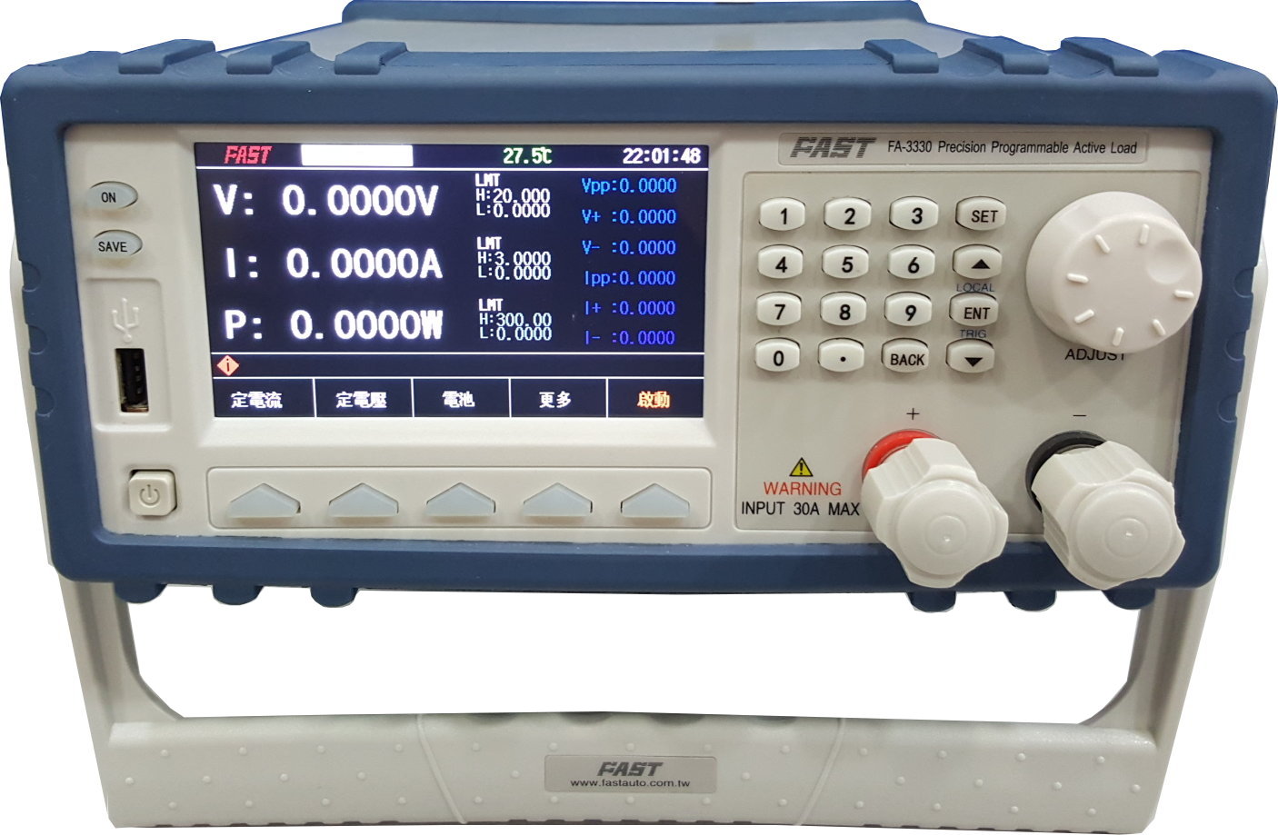 | Model: FA- 3300系列 FA-3300電子負載說明書下載(PDF格式) 產品簡介: FA-3300 系列電子負載是我公司在電子負載領域多年的專業積累,和廣泛的客戶基礎上,最新推出的新一代高性能多功能程式控制直流電子負載。採用高性能ARM 處理器配合500kHz 高速採樣AD,可更精准的類比各類電源負載特性;4.3 寸TFT 彩屏支援中英文介面,配合精心設計的引導式功能表,操作得心應手;顯示資訊豐富全面,直觀方便;擁有0.0001 的更高顯示解析度,更能精確監控被測產品的電壓電流細節;USB HOST 、USB Device,可方便與PC 進行資料通訊及資料保存,並可以方便的使用Usb隨身碟進行固件升級;全面的比較器功能配合HANDLER 介面,使得生產線批量測試和系統化測試更加有保障;擁有豐富全面的負載功能:定電流CC,定電壓CV,定功率CP,定電阻CR,CR-LED 測試模式(真是類比驅動電源特性),電池放電測試(螢幕可以顯示即時放電曲線),動態測試(測試電源動態輸出性能),列表測試(測試電源在多種負載條件下的表現)及編程測試(捕獲電源產品的臨界參數);柔性的軟硬體構架可滿足用戶訂制組合測試功能的要求,從而提高生產線測試效率;智慧化的風扇控制和優良的散熱性能,配合過電壓、過電流、過功率、過熱和電壓極性反接等多種完善的保護報警措施,使得儀器更具可靠性和安全性;儀器全系標配有USB 介面,配合豐富的SCPI指令集,可方便連接到電腦,進行即時資料採集和儀器控制。性能優越的電子負載可廣泛運用於電源變壓器,充電器,開關電源,各類電池等行業的生產線測試、產品老練與實驗室等試驗研發領域。